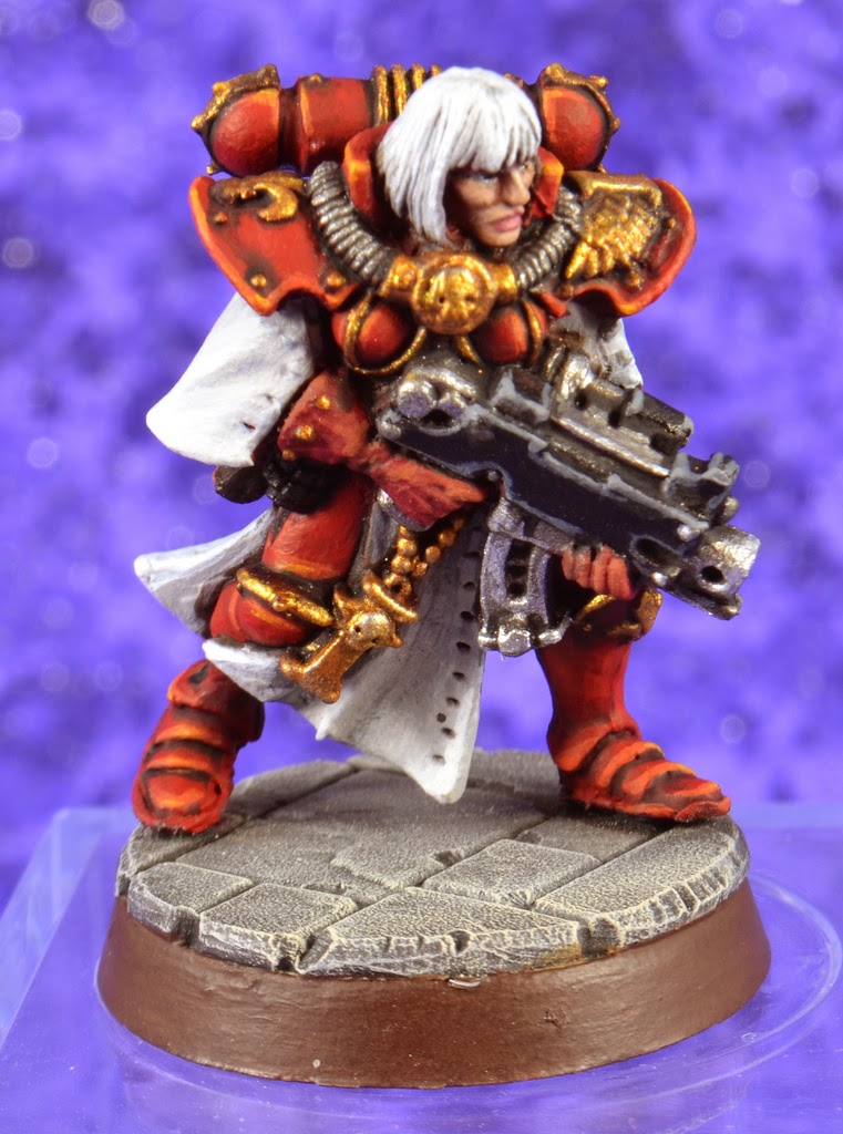 This pass was much more along the lines of what I thought this bad ass Space Nun should look like. I used Citadel Mephiston Red base (or 'foundation') paint. I just painted directly over my previous Reaper Violet Red. I then used an orange edge highlight with a yellow final highlight. This really made the model stand out at normal gaming distance, but still looked great close in. My friend was pleased with this version and now I'm ready to move along.